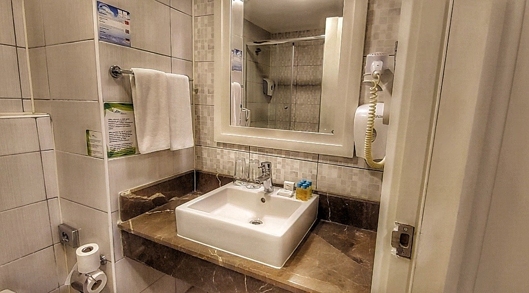 The meal system is ALL INCLUSIVE Breakfast between 07:00 and 10:00, late breakfast between 10:00 and 10:30, lunch between 12:30 and 14:00, dinner between 19:00 and 21 : 00; midnight snacks between 11:30 pm and 12:30 am. The restaurant has a large terrace facing the beach, and the food is very varied and tasty. In the main restaurant I tasted seafood and delicious Turkish specialties, very good cakes and there is ice cream at the entrance.