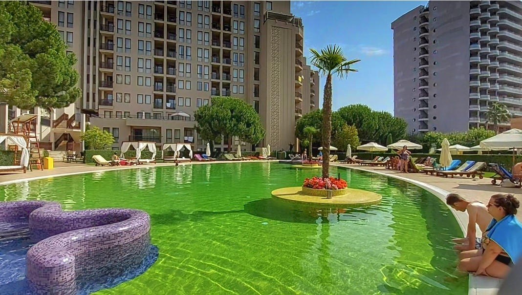 The resort also has a SPA with indoor and outdoor jacuzzi, sauna, massage, steam bath, Turkish bath, fitness room, indoor pool, 2 outdoor pools, children's pools, kids club, wireless internet, children's playground , underground parking, beauty salon, hairdresser and shopping mall and a 2 levels underground parking.
