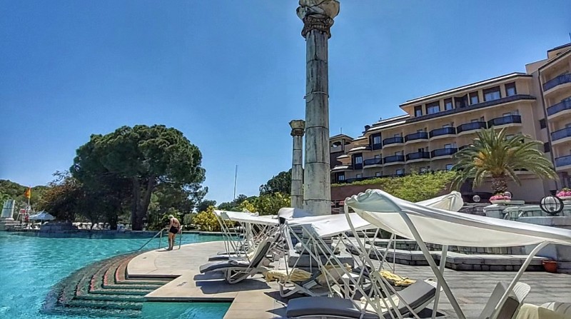 In 2017 I visited the Xanadu Hotel High Class for the first time and it stayed in my mind for a very long time. Its architecture reconstructs the image of ancient Rome, with pillars surrounding the large swimming pool, vessels and Roman decorations of a special elegance in which flowers were placed and a beautiful pine forest that surrounds the resort, giving it not only fresh air but also shade.